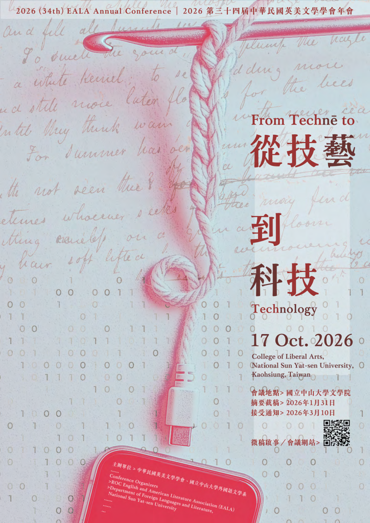 由中華民國英美文學學會、國立中山大學外文系共同主辦的第34屆英美文學年會將於2026年10月17日在中山大學舉行。