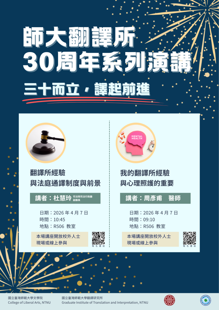 【講座資訊】本所三十周年慶系列講座-2&3│周彥甫醫師、杜慧玲副廳長