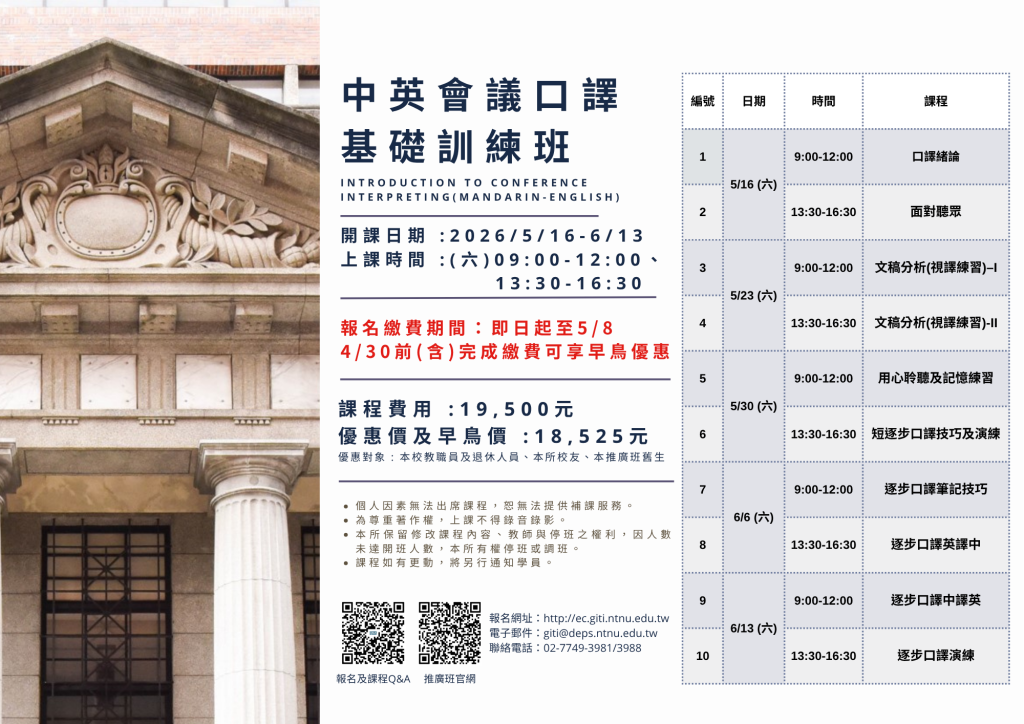 本所115年第1期【中英會議口譯基礎訓練)】周六班 Introduction to Conference Interpreting (Mandarin-English) [開放報名中]。